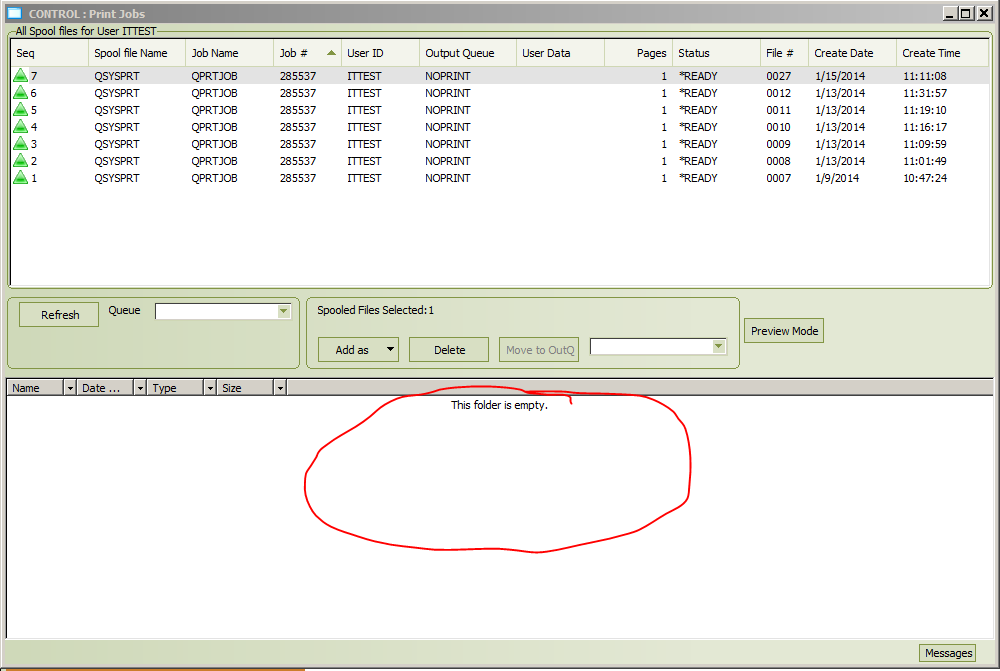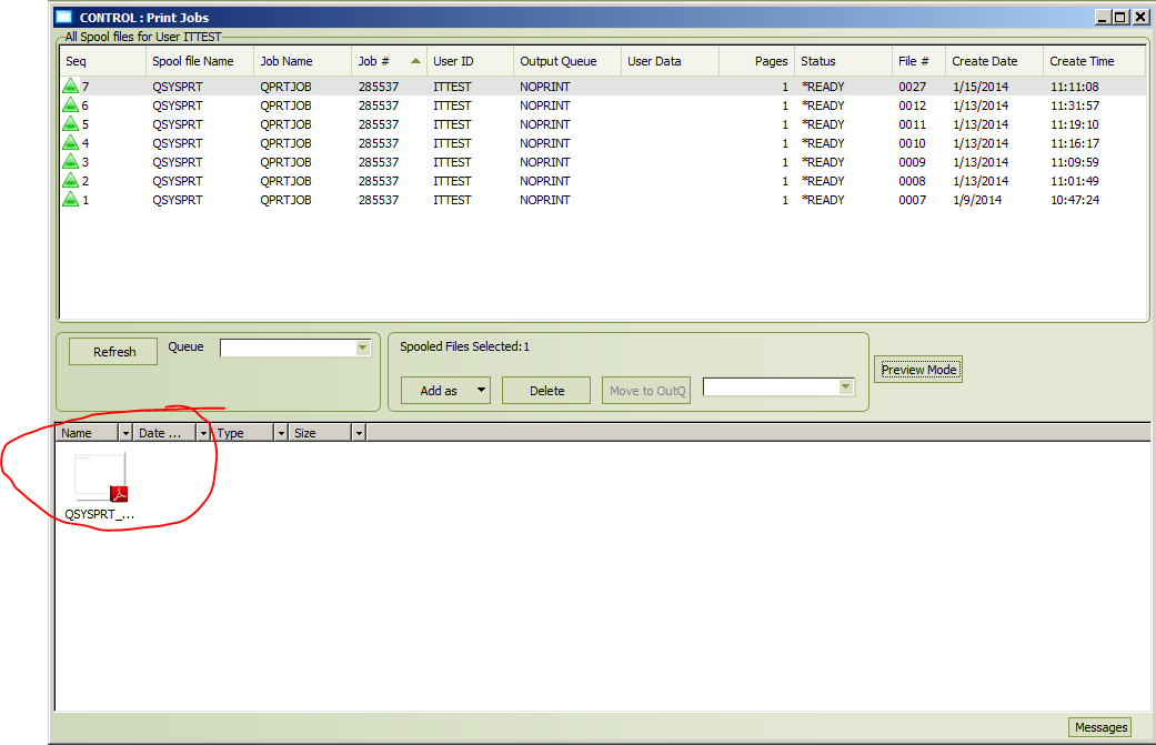The “Save Mode” button is used when you want to keep a permanent copy of a spool file listed in the top half of the window. To create this permanent copy, click on the “Preview Mode” button so that it says “Save Mode” and then double click on a spool file in the top half of the window. You will then see a PDF copy of the spool file in the bottom half of the window. Please only use this “Save Mode” option when you really need to.