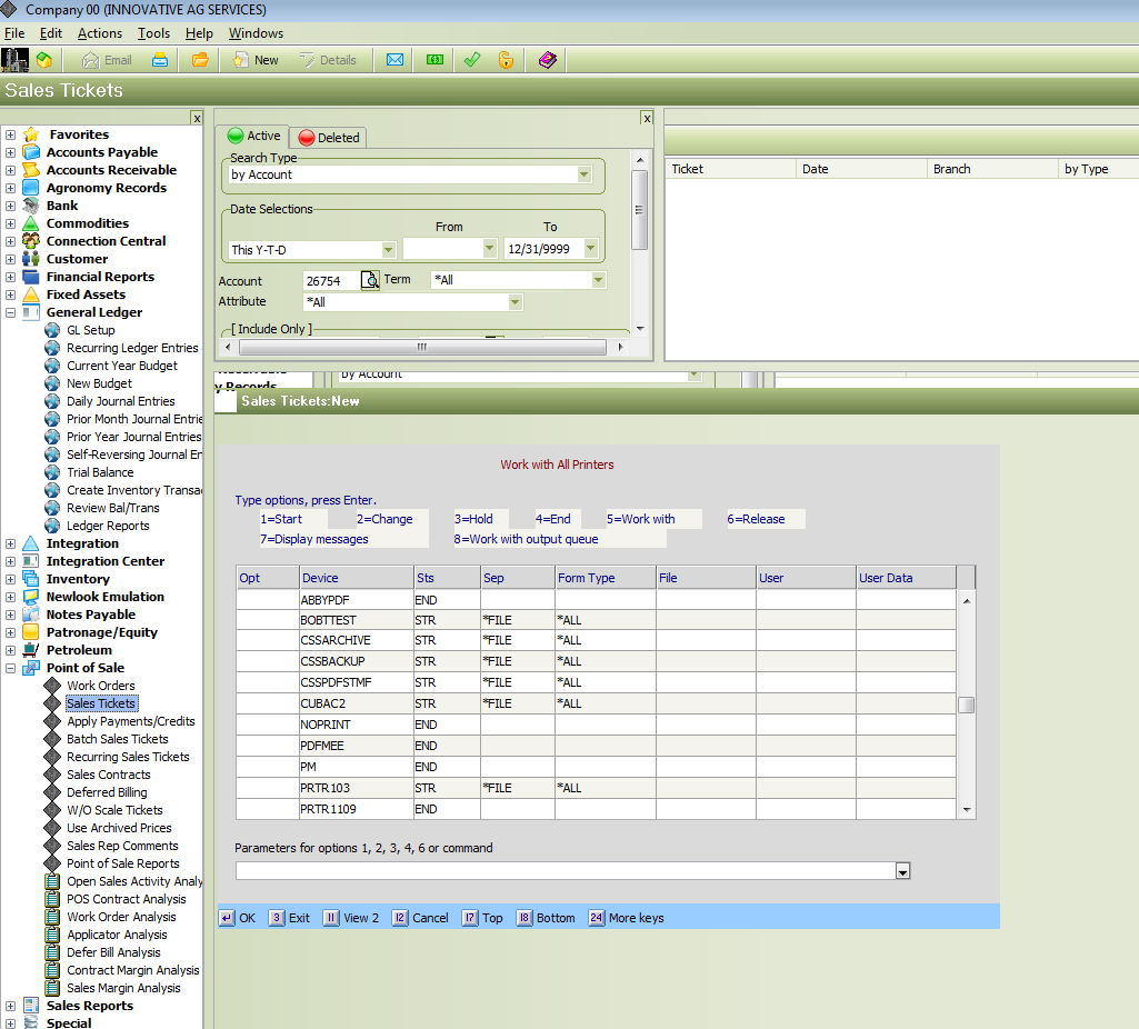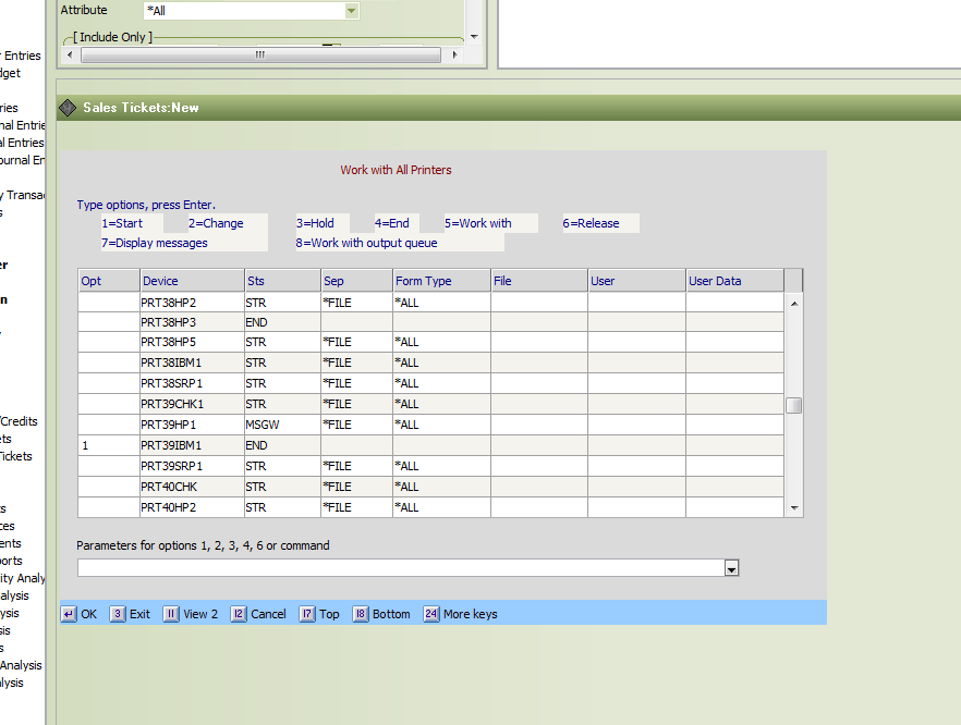 If the printer is in the ended status place a 1 in the Opt column the press Enter.